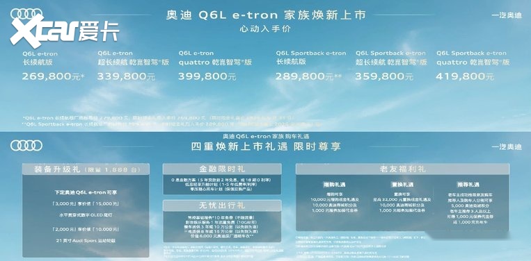 2026年4月10日,一汽奥迪智电科技日暨智电旗舰新品发布会在长春奥迪一汽超级智能生态工厂举办。豪华智电驾享SUV奥迪Q6L e-tron家族焕新上市,其中,奥迪Q6L e-tron长续航版限时心动入手价26.98万元*、超长续航乾崑智驾®版33.98万元、quattro乾崑智驾®版39.98万元;奥迪Q6L Sportback e-tron长续航版限时心动入手价28.98万元**、超长续航乾崑智驾®版35.98万元、quattro乾崑智驾®版41.98万元。