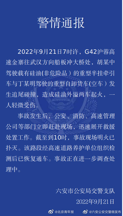 2022年9月21日7时许,G42沪蓉高速金寨往武汉方向船板冲大桥处,胡某中驾驭载有硅油(非危险品)的重型半挂牵引车与丁某明驾驭的重型自卸卡车(空车)产生追尾磕碰,形成硅油外溢两车起火,一人细微受伤。 事端产生后,公安、消防、高速办理公司等部分当即赶赴现场,敏捷打开救援处置作业。到到10时,事端现场明火已熄灭。该路段经高速路途维护单位安排检测后已康复通车。事端正在进一步查询处理中。@六安公安交警微发布